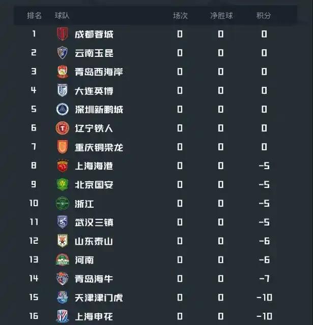 申花-10分;泰山-7分;国安、海港-5分;蓉城不负分。